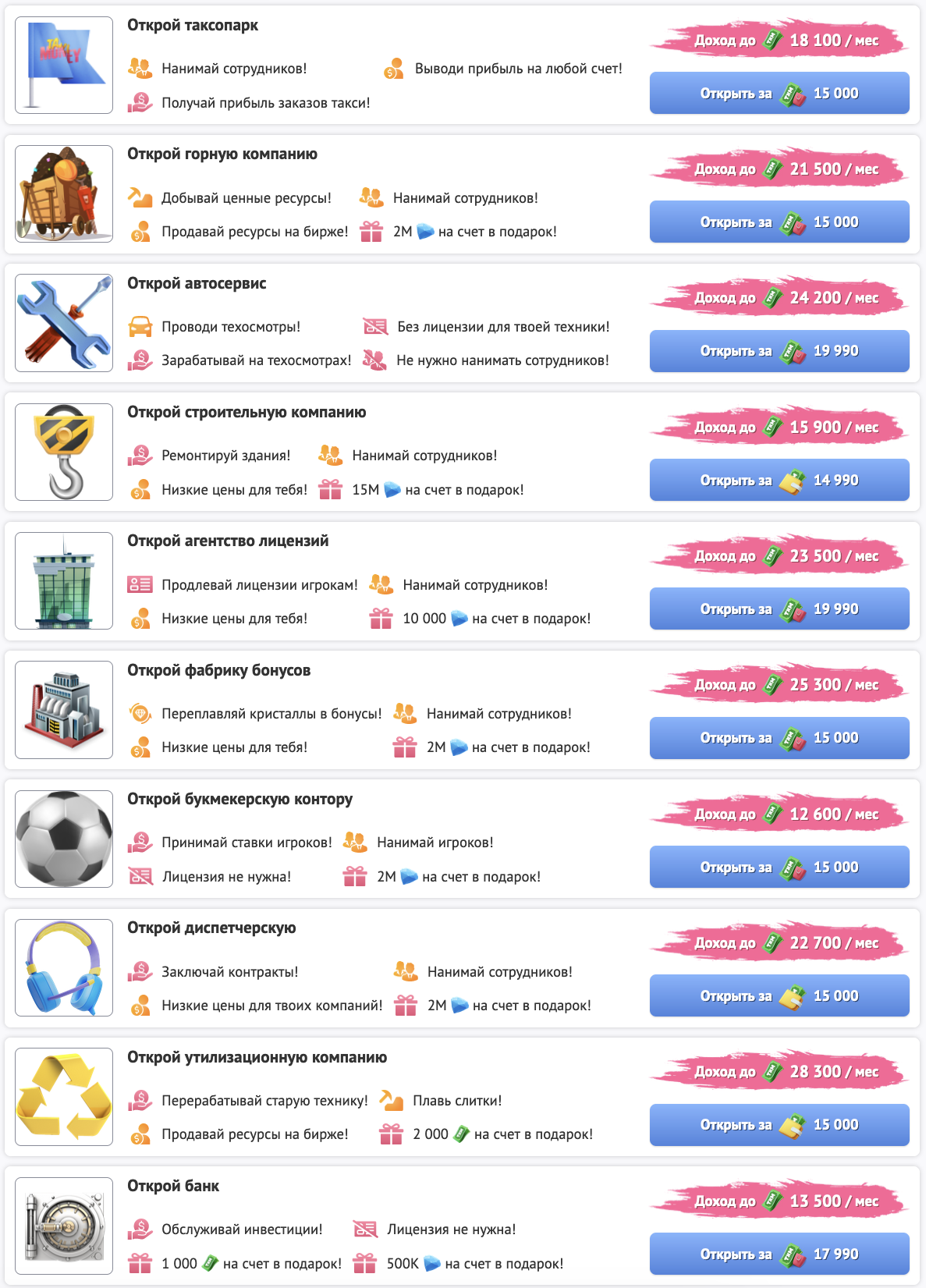В нашей игре предусмотрены такие виды бизнеса, как: