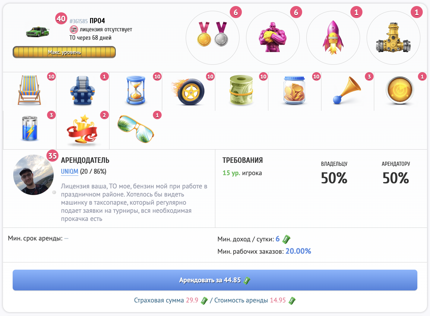 Начните свой маленький бизнес 一 сдайте своё такси или бульдозер в аренду другому игроку и наблюдайте, как стремительно растёт ваш пассивный доход. И зарабатывайте еще больше, увеличивая свой гараж.