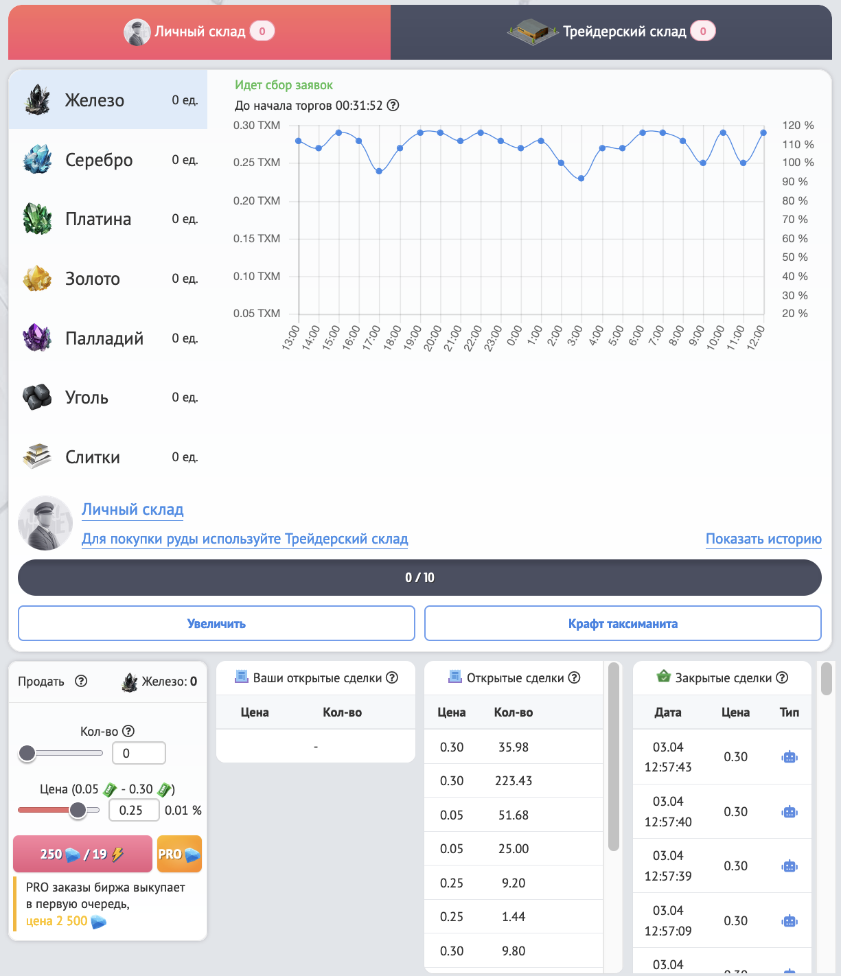 Установите цену и выберете количество которые Вы хотите продать. Учтите, что биржа выкупает в первую очередь PRO заказы и самую недорогую руду.