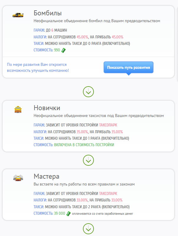 В городе имеется 7 типов компаний. Карьеру бизнесмена, все пользователи создавшие компанию без таксопарка в полисе, начинают с типа «Бомбила» и могут шаг за шагом повышать тип компании. Каждый новый тип компании позволяет владельцу нанять больше сотрудников с более высоким уровнем такси. Чем выше тип компании, тем больше заработок и доход.