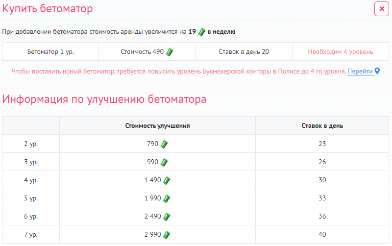Увеличивайте уровень Ваших бетоматоров, нажав на кнопку с шестерёнкой рядом с каждой из них. Чем Выше уровень Вашего бетоматора, тем больше ставок в сутки он может обработать. Так, на максимальном 7-м уровне бетоматора Вы сможете принимать вплоть до 40 ставок в сутки с одного окна.