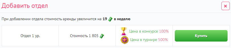 Далее выберите интересующий Вас отдел, и нажмите на кнопку «Нанять отдел». Отделы отличаются типами и размерами предоставляемых бонусов. Чем выше уровень отдела, тем больше типов бонусов он может предоставлять компаниям-клиентам.