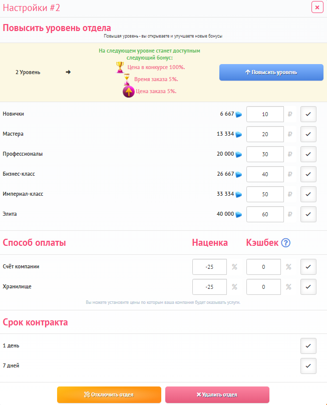 Нажмите на кнопку с пиктограммой шестерёнки, чтобы настроить выбранный отдел. Вы можете выбрать уровни компаний, которым доступен данный отдел, возможную длительность контракта, а также способы оплаты контракта и соответствующие цены.