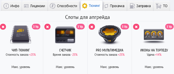 Внимание! Тюнинг и вещи такси - взаимозаменяемы. Если на такси можно устанавливать вещи, то она не имеет слотов для тюнинга, описанных ниже. И наоборот: если не умеет устанавливать вещи, то может устанавливать апгрейды в слоты тюнинга. О том, умеет ли такси устанавливать вещи всегда написано в описании характеристик такси.