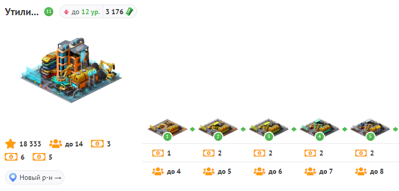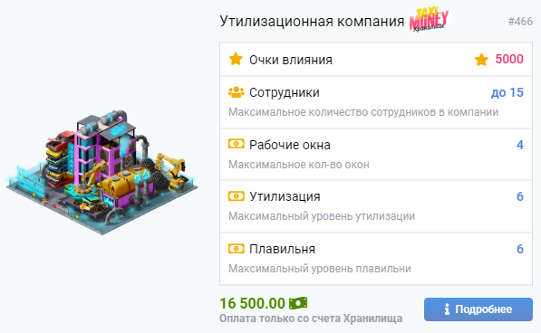 Повышайте уровень здания Утилизационной компании, чтобы увеличивать количество рабочих мест в компании, максимальное количество доступных для открытия окон, максимальный доступный уровень утилизационного и плавильного рабочих мест, а также увеличивать количество очков влияния в Полисе.