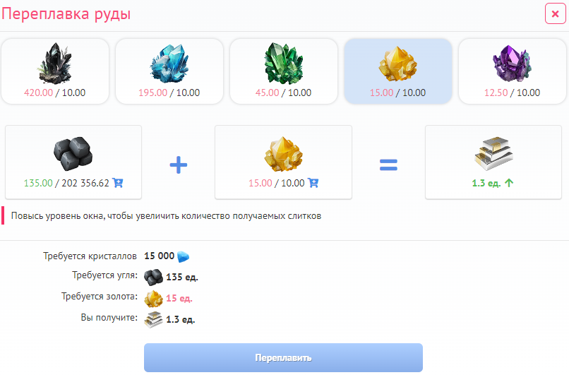 Для переплавки руды Вам необходимо выбрать, какую руду Вы хотите соединить с углём для переработки, и нажать на кнопку «Переплавить».