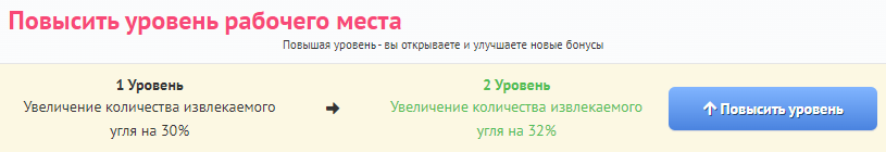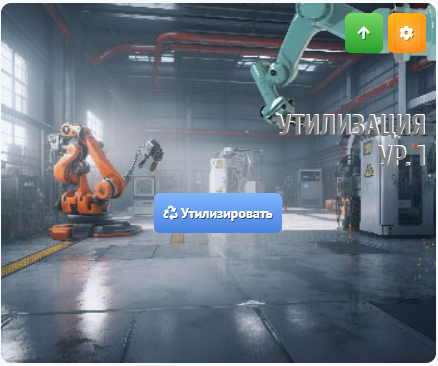 Нажмите на зелёную кнопку со стрелкой в правом верхнем углу блока рабочего места, чтобы повысить его уровень. Чем выше уровень утилизационного рабочего места, тем больше угля Вы сможете извлекать из утилизируемой техники.
