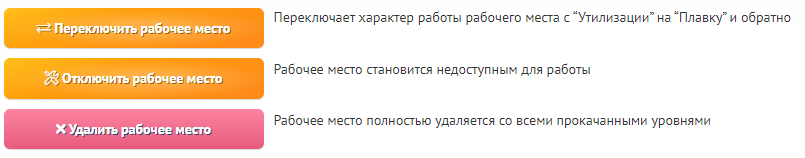 Кроме того, в блоке настроек рабочего места можно: переключить рабочее место с «Утилизации» на «Плавку» и обратно, временно отключить рабочее место или полностью удалить его.