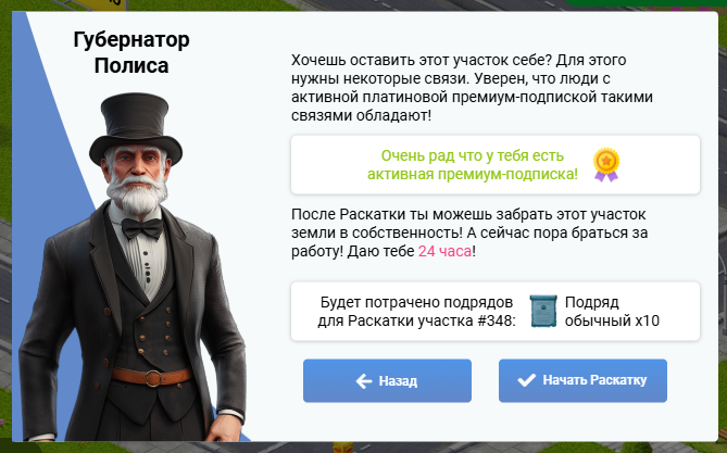 Если Вы не успеете раскатать участок за 24 часа, то участок останется в полисе, а Ваши подряды сгорят и любой другой игрок сможет начать раскатку этого участка.