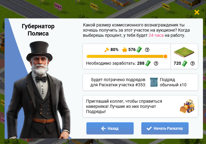 Если же Вы все таки решили продать участок на аукционе, то перед началом раскатки Вам нужно будет указать % прибыли, который Вы получите с продажи. Чем больше прибыли Вы получите, тем больше заказов для его раскатки потребуется.