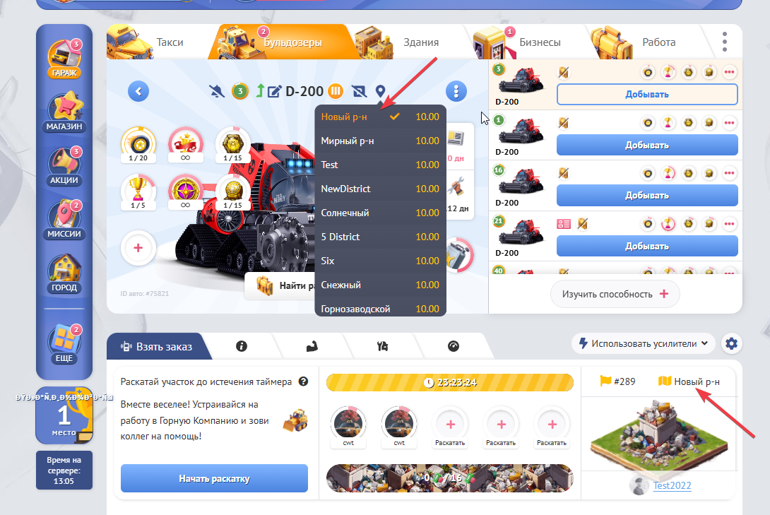 После того как Вы определились, что будет с участком после его раскатки переходим в Гараж и кликаем по бульдозеру. После чего Вы можете приступать к процессу раскатки кликнув “Начать Раскатк” или “Раскатать”.
