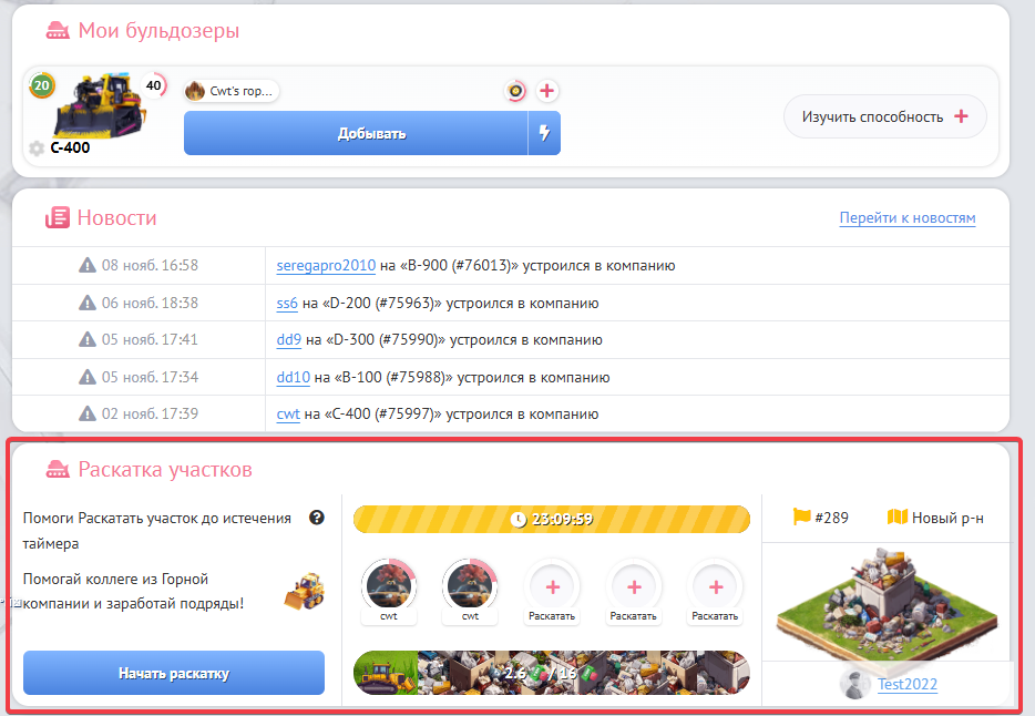 Коллеги по горной компании, которые придут к Вам на помощь, могут помогать в раскатке участка только на тех бульдозерах, которые трудоустроены в данной компании. И все также не больше пяти человек на одну раскатку одновременно.