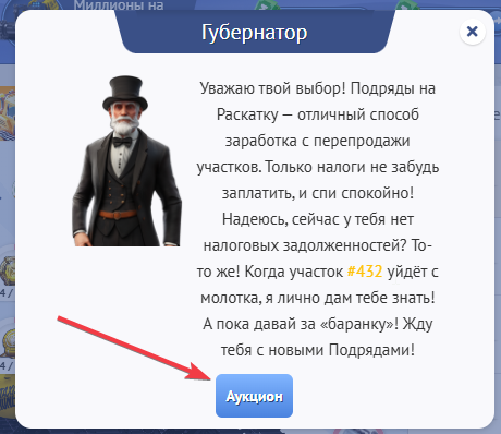 Способ первый - кликнуть по кнопке аукцион во всплывающем окне с губернатором.
