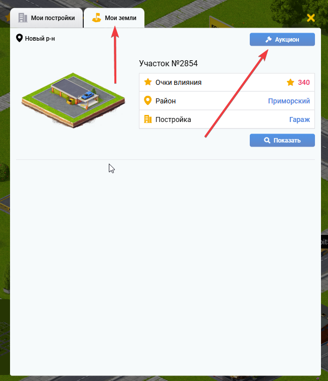 В появившемся окне нужно перейти во вкладку “Мои земли”, после чего нажать на “Аукцион”