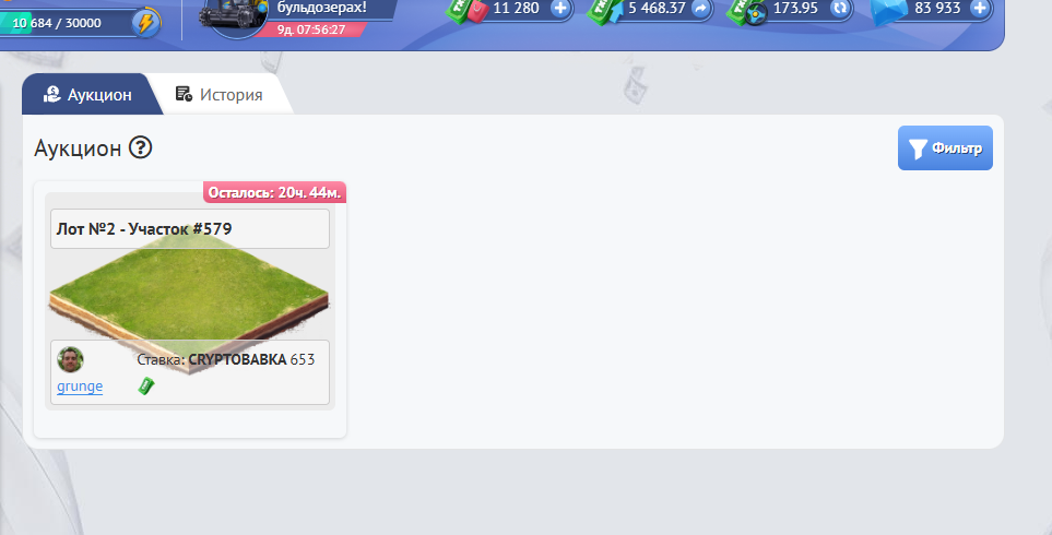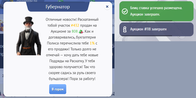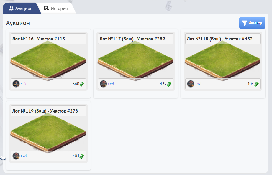 Все участки, которые будут успешно раскатаны Вами или другим игроками будут появляться на Аукционе