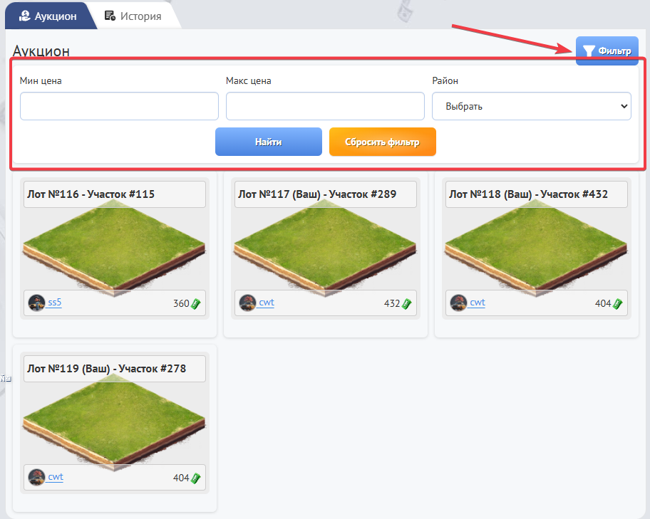 По итогу, Вы окажитесь на главной страницы аукциона, где будут представлены все доступные лоты(участки) для покупки