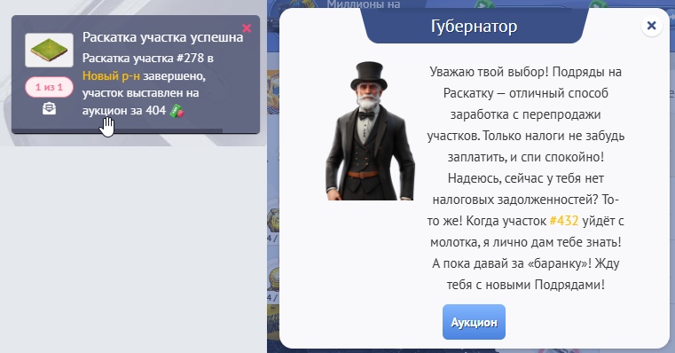 После того, как Вы успешно завершили Раскатку участка перед этим выбрав путь его продажи на аукционе и сделав все настройки: