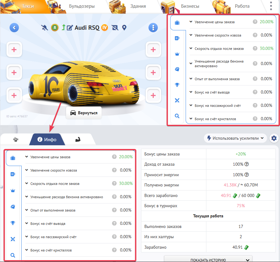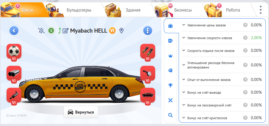 Бонусы теперь разделены по типам заказов, что позволяет более точно настроить такси под ваши нужды. Например, бонус на скорость выполнения заказа может работать только для рабочих заказов, а не для конкурсов или халтуры.