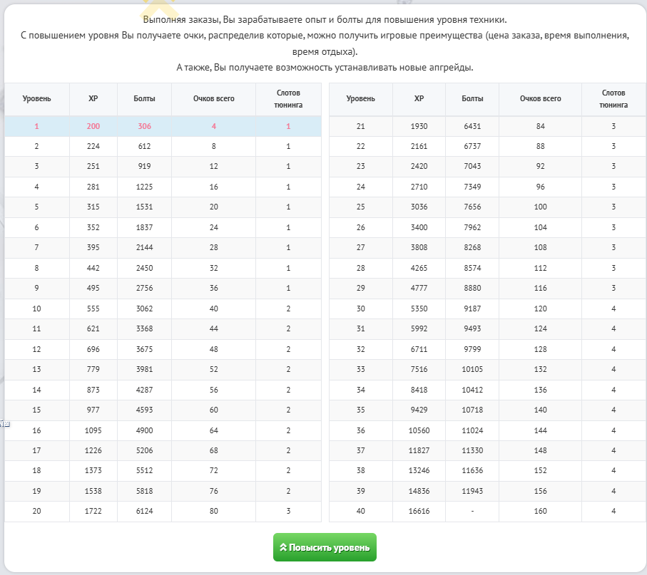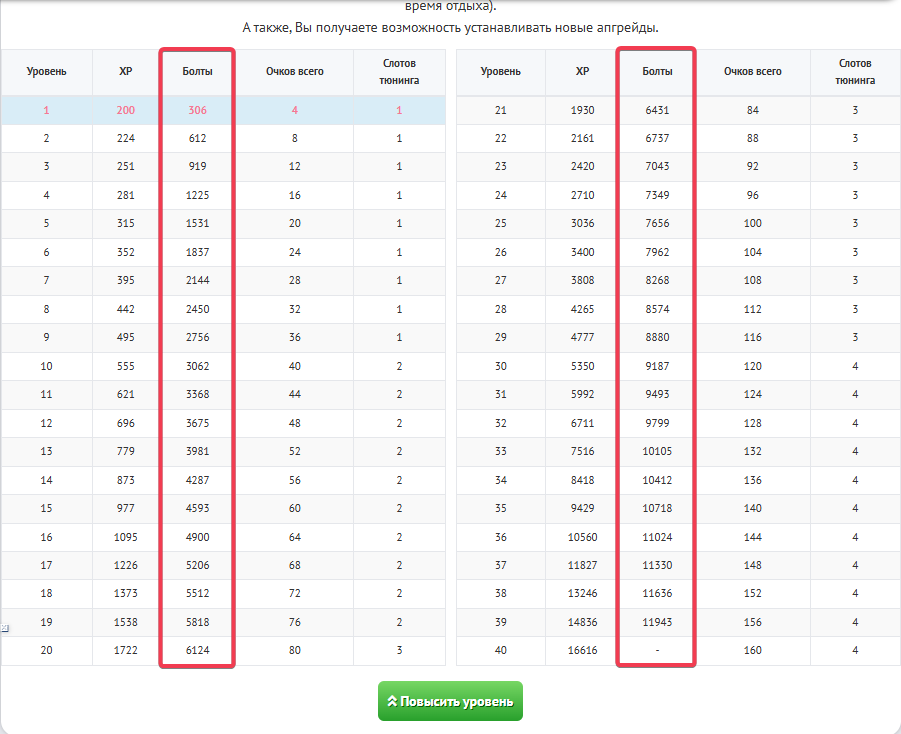 Для каждого такси необходимо разное количество болтов, посмотреть это количество можно в меню прокачки уровней