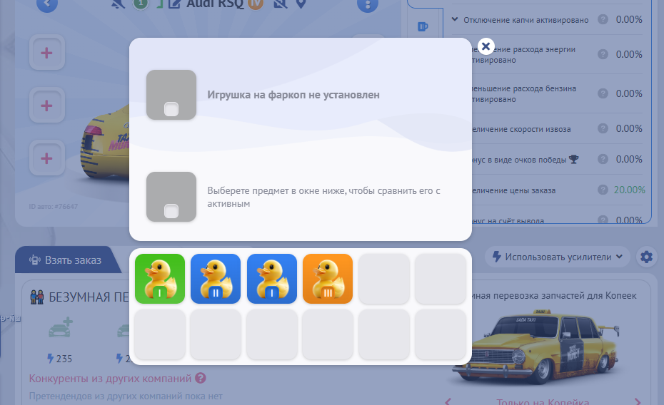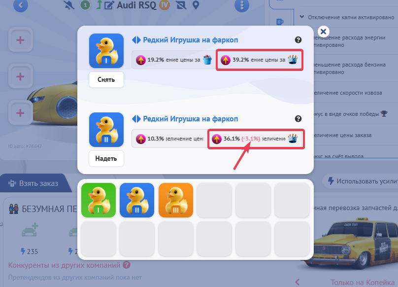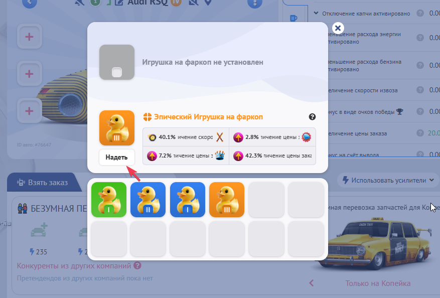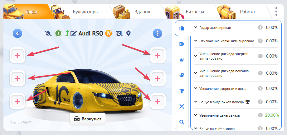 На новых типах такси вещи заменяют очки распределения способностей и апгрейды. Теперь не нужно будет тратить деньги на прокачку, ведь Вы можете просто надеть нужную вещь из Вашего инвентаря, чтобы улучшить характеристики своих авто. А, когда такси откатает свой ресурс, то можно просто снять вещь и поставить ее на другое такси абсолютно бесплатно.