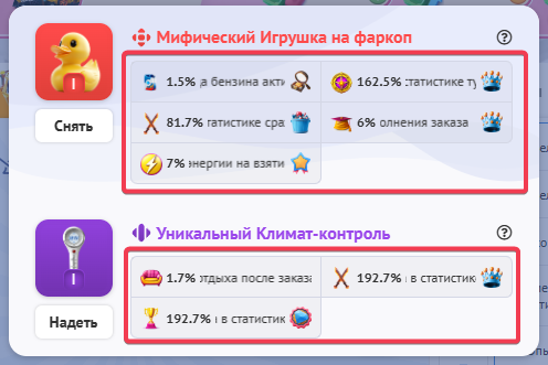 Вещи такси — это бесплатные игровые предметы, которые дают бонусы к характеристикам новых типов такси (старые типы такси не могут надевать вещи). Они позволяют улучшать параметры такси, делая его более эффективным для выполнения заказов и участия в игровых активностях.