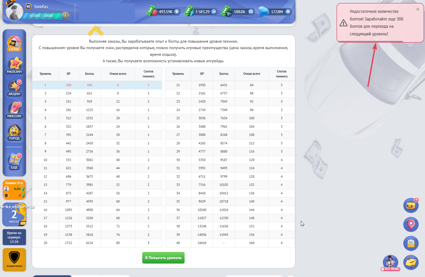 Если Вам не будет хватать болтов, то при нажатии Вы увидите уведомление с недостающим количеством болтов для прокачки