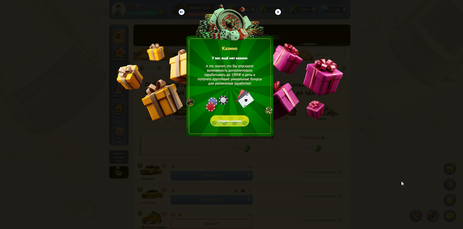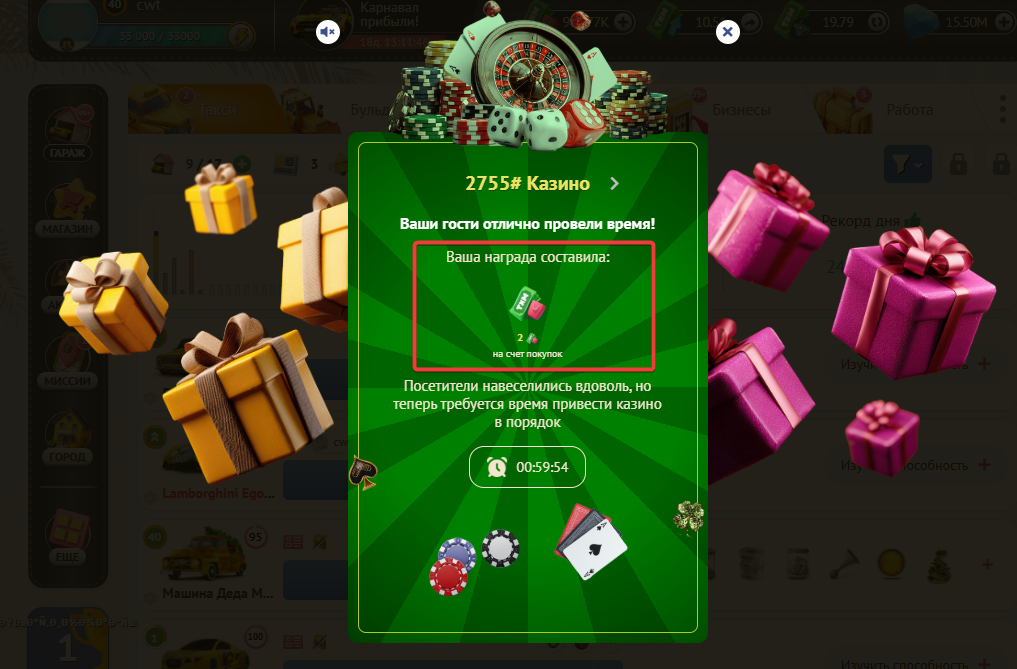 На каждом уровне здания Казино Вы гарантированно получаете сумму на Пассажирский счет, а также дополнительную награду. Такой наградой могут быть: деньги на бонусный счет, кристаллы, бонусы для такси и бульдозеров и лутбоксы.