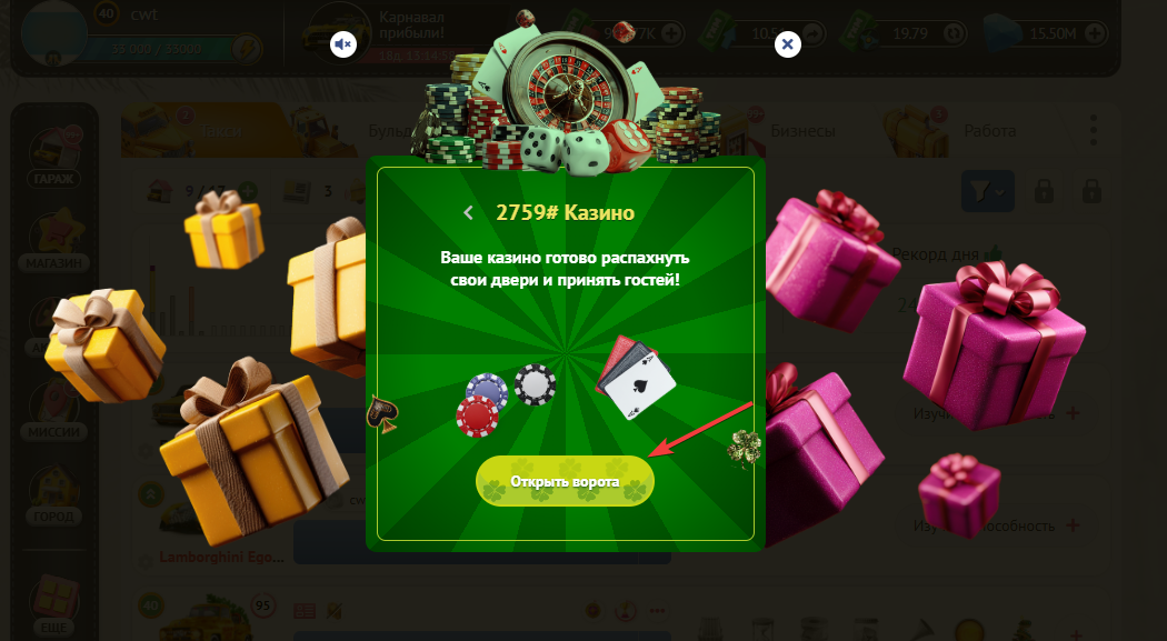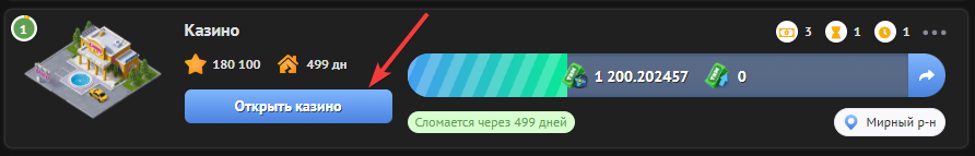 Чтобы построить “Казино” нужно нажать на кнопку “Открыть казино”