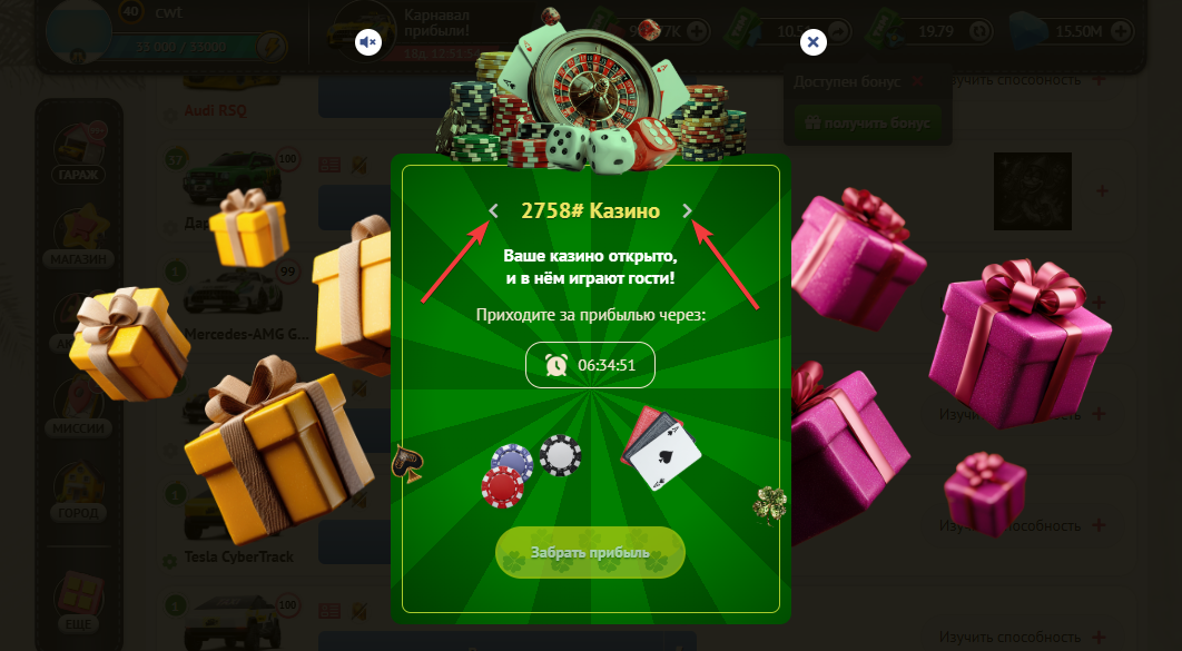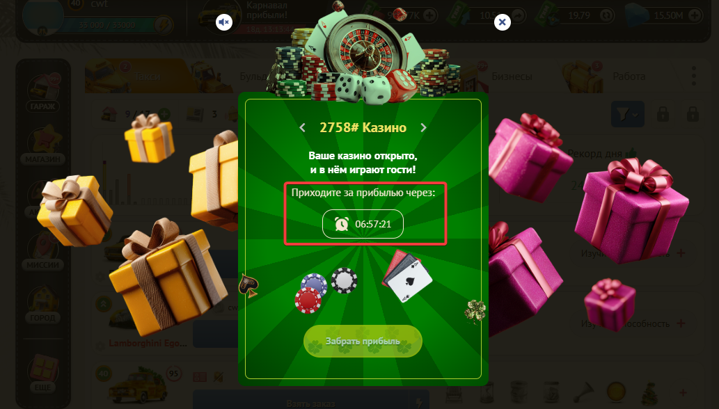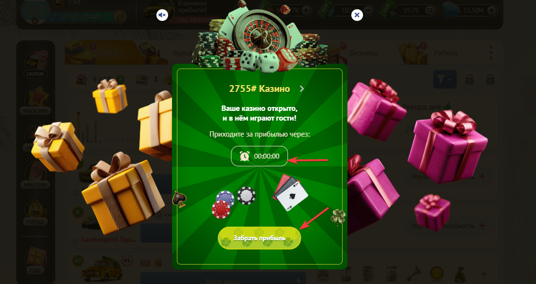 По истечению этого таймера, Вы снова сможете открыть свое Казино для генерации наград.