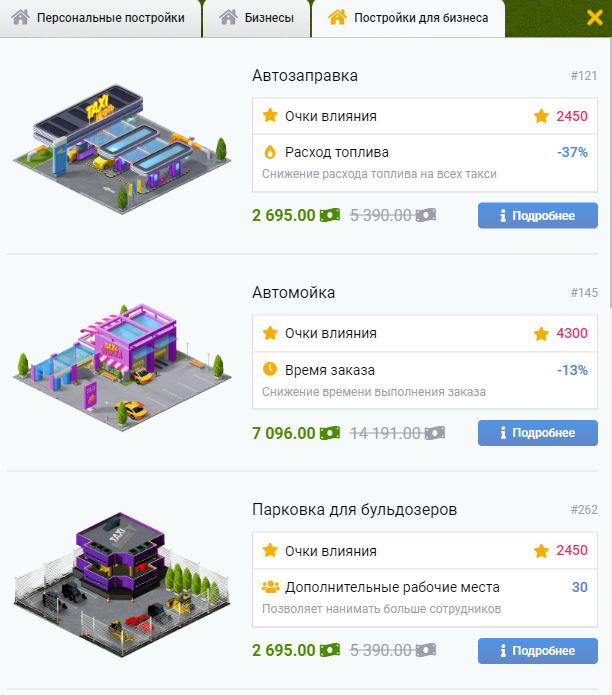 Каждое здание улучшает определенные характеристики бизнеса, такие как увеличение стоимости заказа, увеличение скорости развоза, снижение расхода энергии, топлива, вместимость склада и многое другое – конкретное описание доступно при нажатии на кнопку «подробнее» .