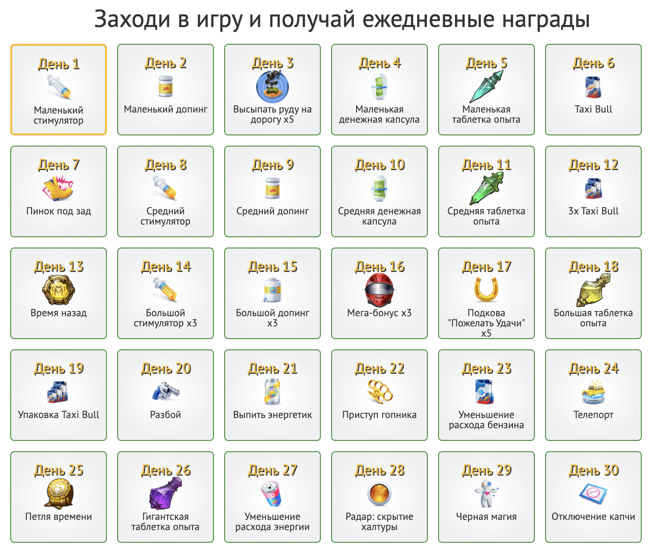 Заходите в игру каждый день, и получайте в подарок товары-усилители из магазина! Эти товары дадут Вам больше возможностей, помогут улучшить Ваши результаты и сделают Ваш опыт в игре максимально приятным!