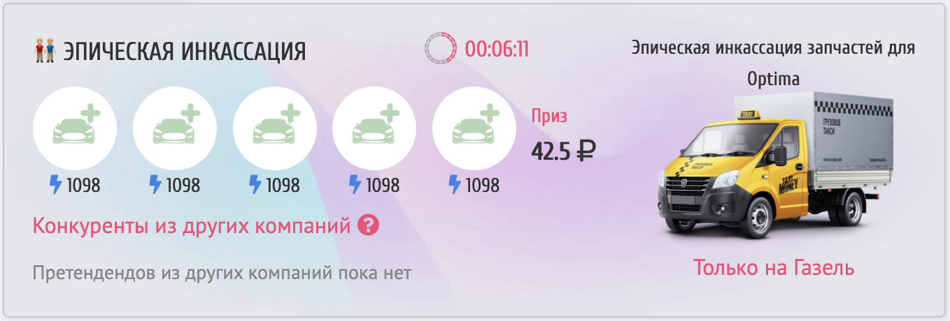 • Командный прорыв — увеличение количества зачисляемых денег в конкурсах «Самый шустрый таксист» и «Самая шустрая компания» до 10%.